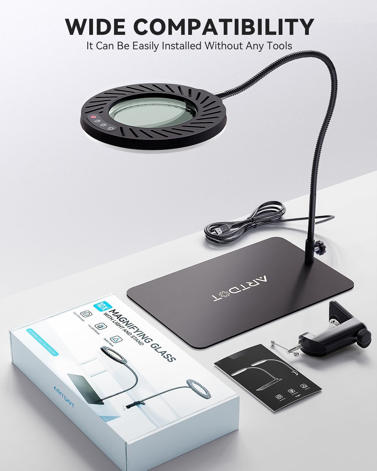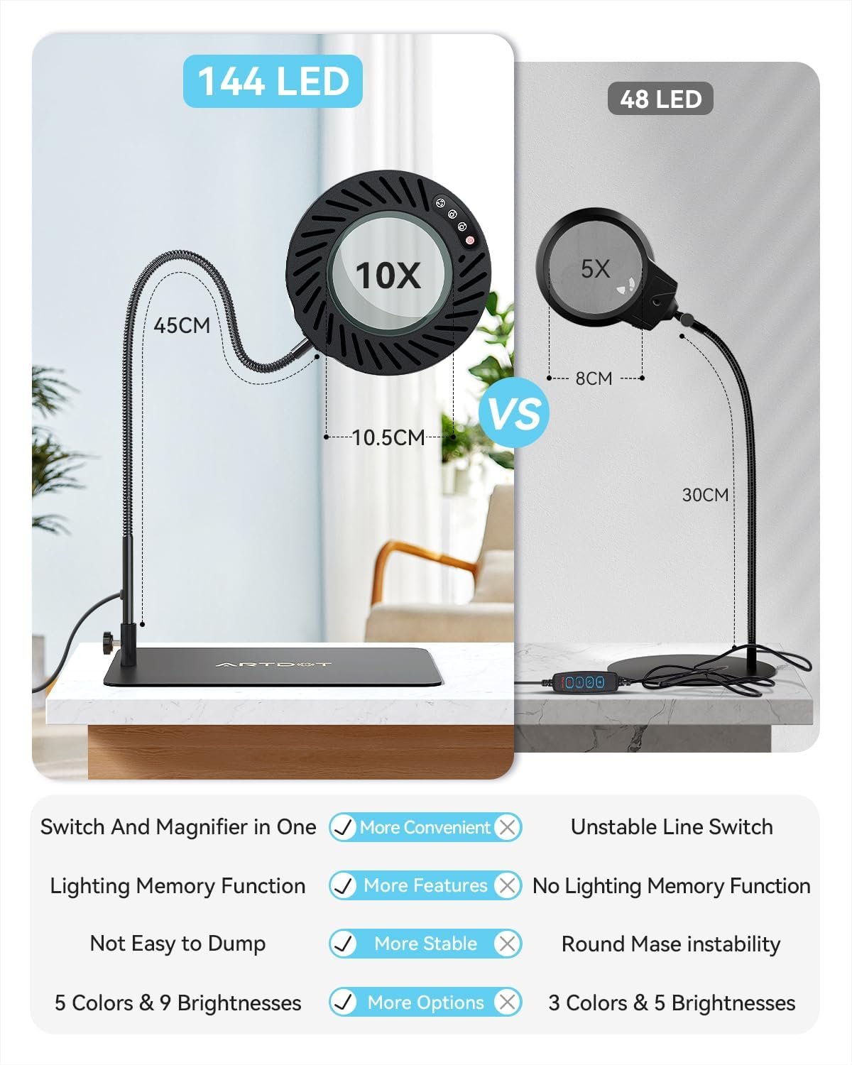 10X Lupe mit Licht und Ständer, Lupenleuchte mit 144 LEDs, 5 Einstellbare Farben und 9 Helligkeitsstufen, als Diamond Painting Zubehör, Lupenlampe für Lesen Basteln Juweliere Modellbau